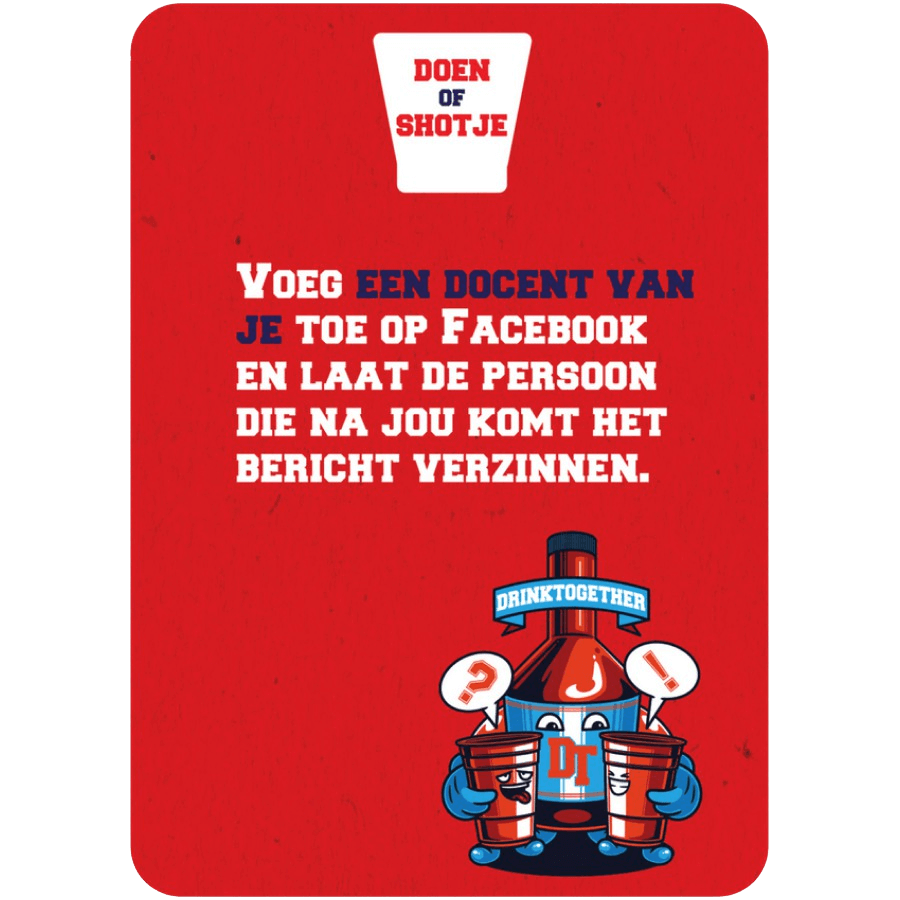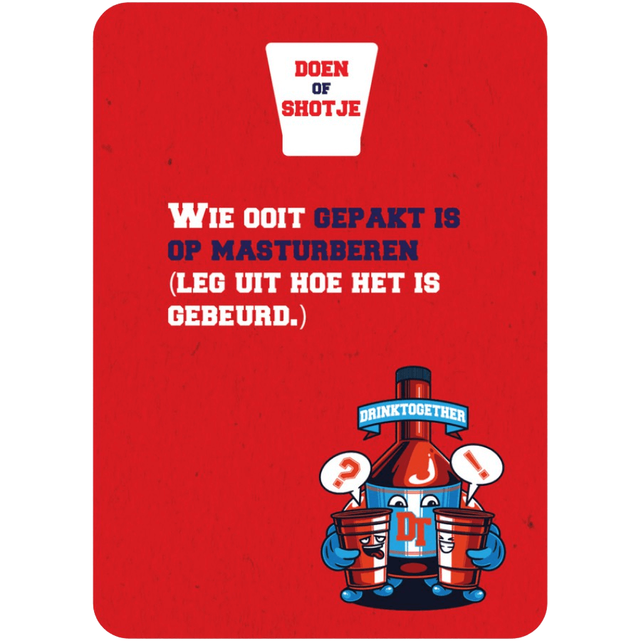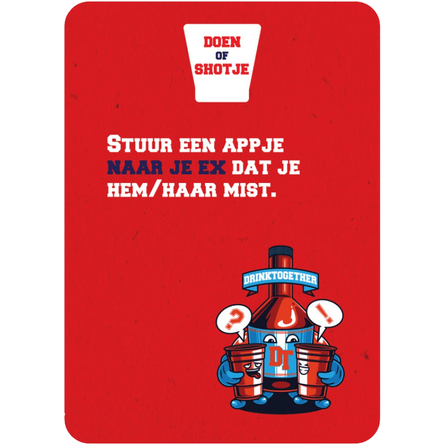 Pak om de beurt een kaart van de stapel en lees jouw vraag of opdracht voor. Voer de opdracht uit of beantwoord de vraag. Doe je dit niet? Dan moet je dealen met de consequentie die op jouw kaart staat. Ga jij black-out van het drinken of voer jij elke challenge uit? Bereid jezelf voor op de meeste gestoorde challenges en onvergetelijke avonden met vrienden.